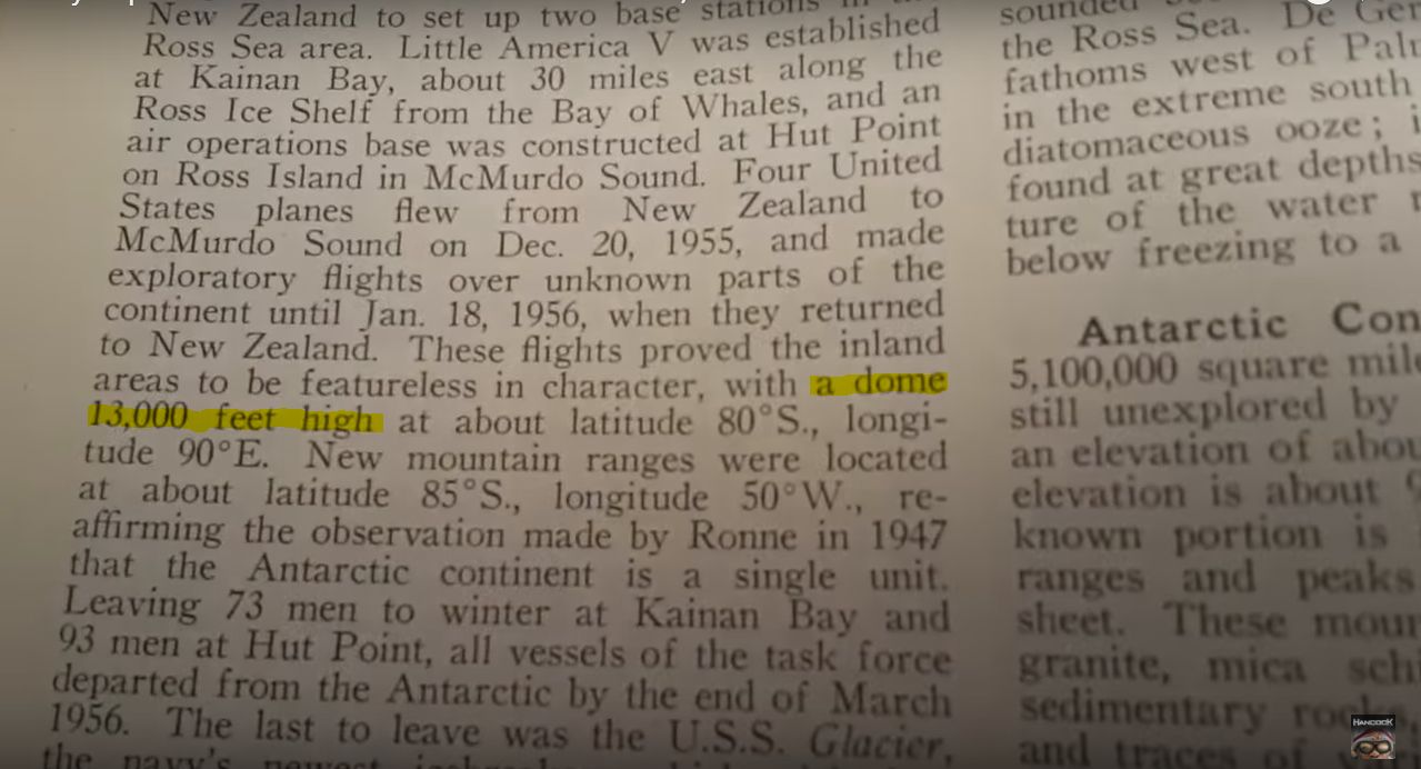 Assista o vídeo e tire suas conclusões. O que seria este Domo mencionado na Enciclopédia Americana de 1958? Veja o Vídeo: ORIGINAL “In December 1955 the task force left New Zealand to set up two base stations in Ross Sea area, Little America V was established at Kainan Bay, about 30 miles east along the Ross…